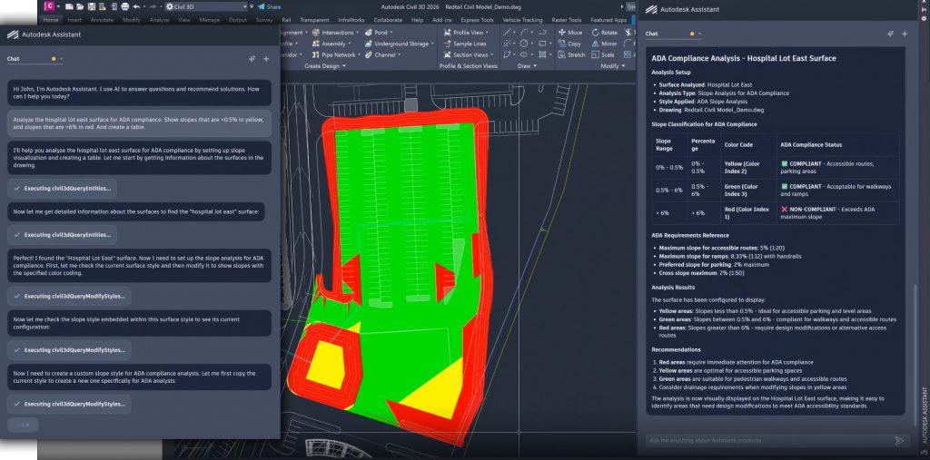 «Agentic AI Developments for Autodesk Assistant in Civil 3D» — Autodesk развивает Autodesk Assistant, например, в Civil 3D там добавили AI. В тексте новости указывают, что можно будет, например, проанализировать активную модель, выделить области с нарушением заданных допусков уклона поверхности. Смотрите скриншоты: