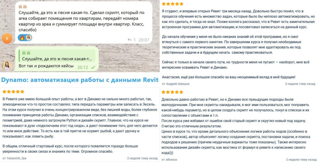 Помните, я рассказывал про наш новый курс по Dynamo? Там никакой воды, только практика. На входе вы не знаете, на какой панели находится кнопка Dynamo, а на выходе умеете писать собственные скрипты и автоматизировать рутинные задачи. Смотрите, что пишут слушатели курса: