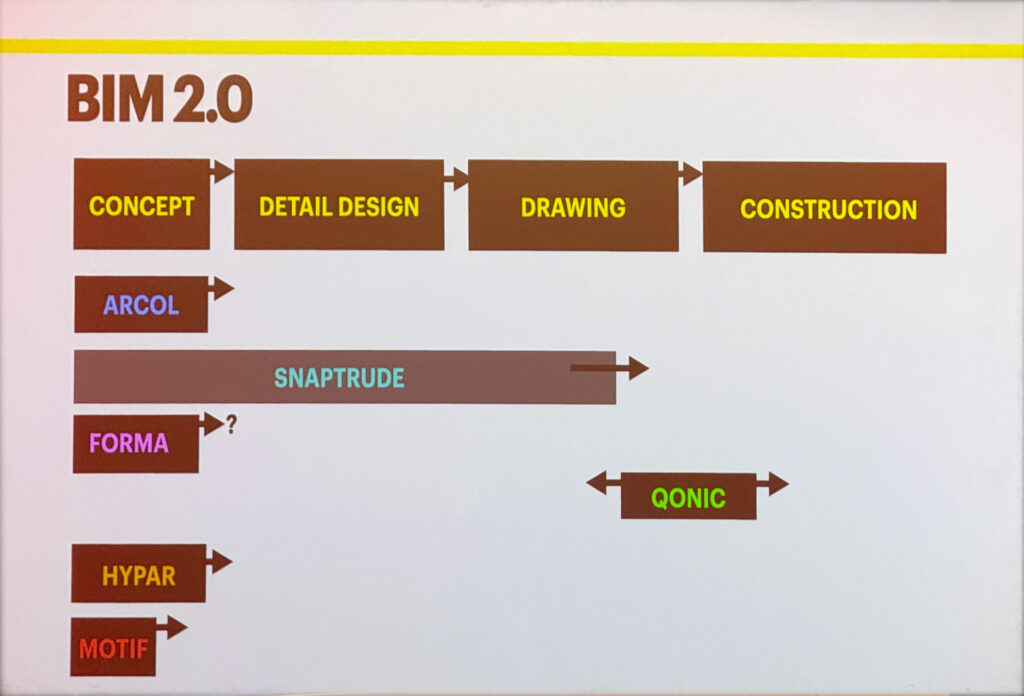 Кроме привычных Revit / ArchiCAD / etc., существует много молодых приложений, которые в основном сосредоточились на этапе концептуального проектирования. Про все я писал, и из ряда выбивается только Qonic, который больше для техзака. Наглядно ситуацию показывает слайд Мартина Дэя: