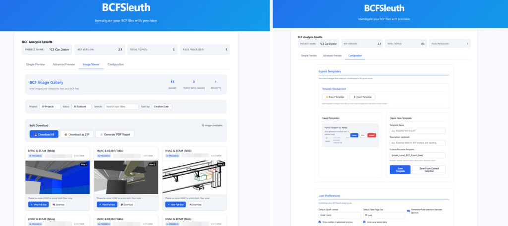 Ну и если говорить про AI… вот свежая разработка — результат вайб-кодинга с Claude и исходниками плагина Sloth от BIM42: «Introducing BCFSleuth». Программа позволяет загружать и просматривать BCF разных версий, экспортировать данные и изображения, работает в браузере. Выглядит очень неплохо: