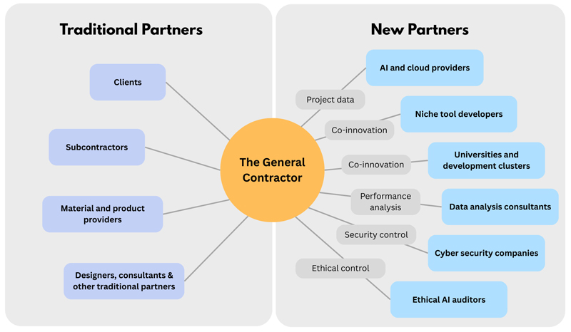 К типичным партнёрам генподрядчика (клиент, субподрядчики, поставщики, проектировщики) добавляются новые: провайдеры AI- и облачных сервисов, разработчики инструментов, дата-аналитики, специалисты по кибербезопасности. Новые роли не получится просто так вписать в старые процессы, их требуется перестроить, сделать универсальными и независимыми от заказчика (в своём ядре, конечно; отдельные моменты будут меняться от проекта к проекту).