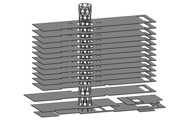 И еще статья про Flux, от Parametricmonkey: (EN) Structural diagrid via Flux. На картинке ниже вантовая башня в центре построена в Revit через импорт во Flux из Grasshopper. Что как-бы полностью подтверждает слова Люка.