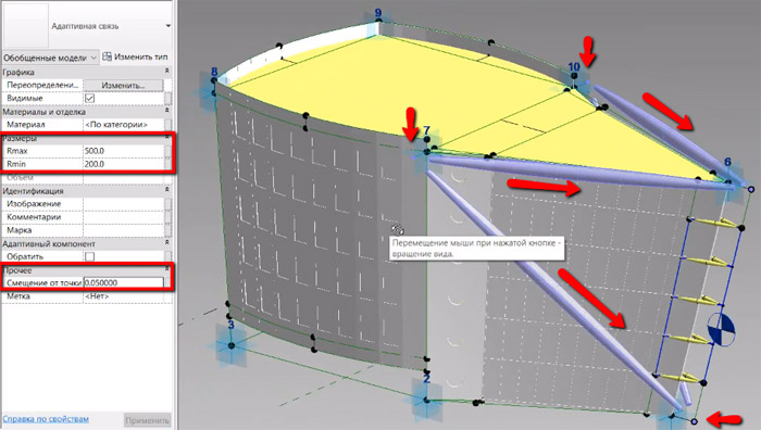- Снова будем использовать адаптивное семейство, которое мы сделали в самом начале — Линии на двух точках. Разместим одно такое на 7 и 10 Адаптивных точках Секции. Присвоим «Вылету» новый параметр — Отступ больших связей = 1500мм