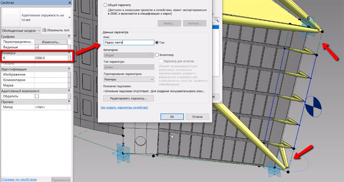 - Для того чтобы сделать кант, используем другое семейство, которое оказалось под рукой: Адаптивная окружность на точке. Дело в том, что при создании адаптивных семейств, у них по умолчанию включена опция Общее семейство. Поэтому мы легко сможем найти его в Диспетчере нашей секции. Или просто нажав на кнопку Разместить компонент — выбрать её из списка. Ставить это семейство будем на наклонную вспомогательную линию, ось будущего канта. Для параметра R присвоим новый параметр Радиус канта=700мм