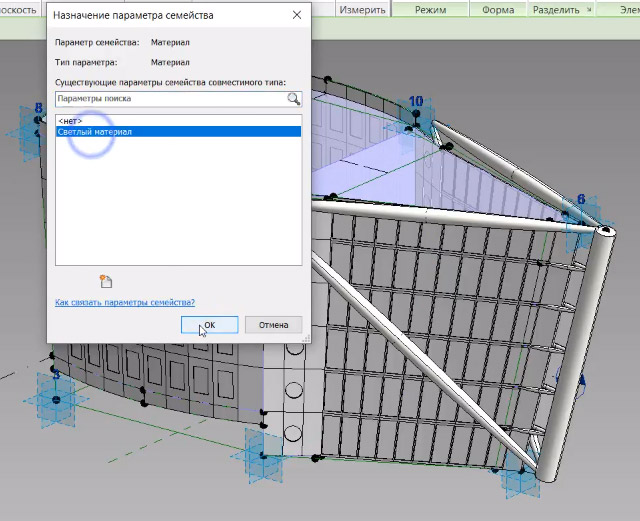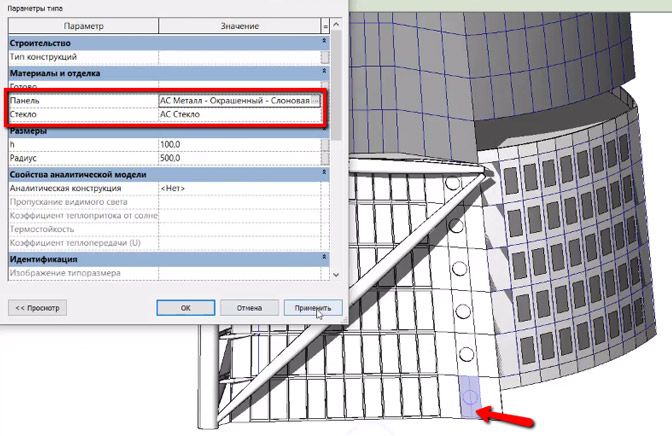 - Теперь можно настроить материалы. С помощью кнопки TAB выберем какую-нибудь панель. (Так как они у нас общие, нам нет необходимости открывать семейства и там что-то назначать). Жмем на кнопку Изменить Тип и назначаем материалы для всех элементов панели. Работу с материалами мы рассматривали в этом цикле статей.