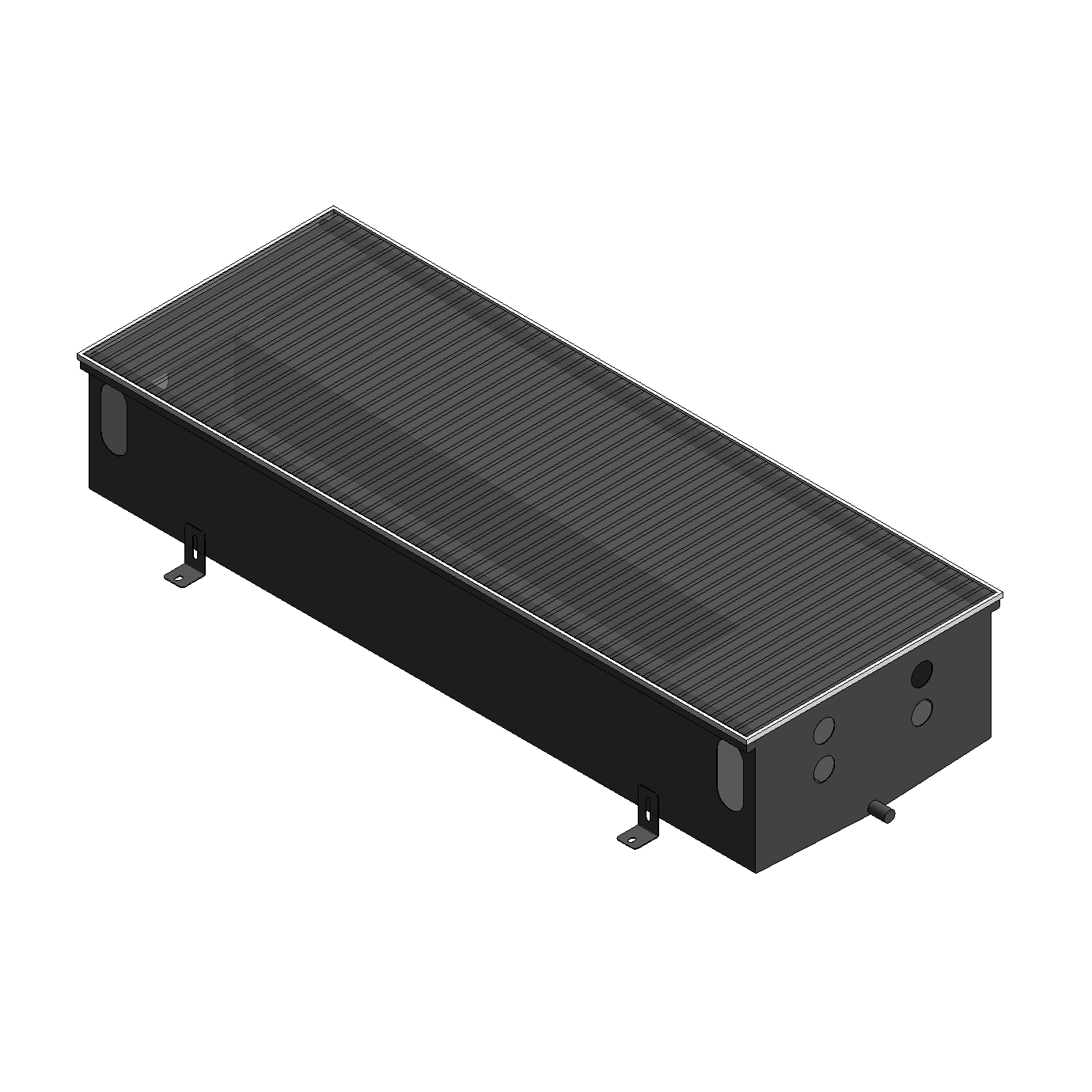 Конвекторы встраиваются в структуру пола, оставляя видимой лишь декоративную решетку из анодированного алюминиевого профиля, полированной нержавеющей стали или ценных пород дерева, которая образует с полом единый дизайн — элемент.